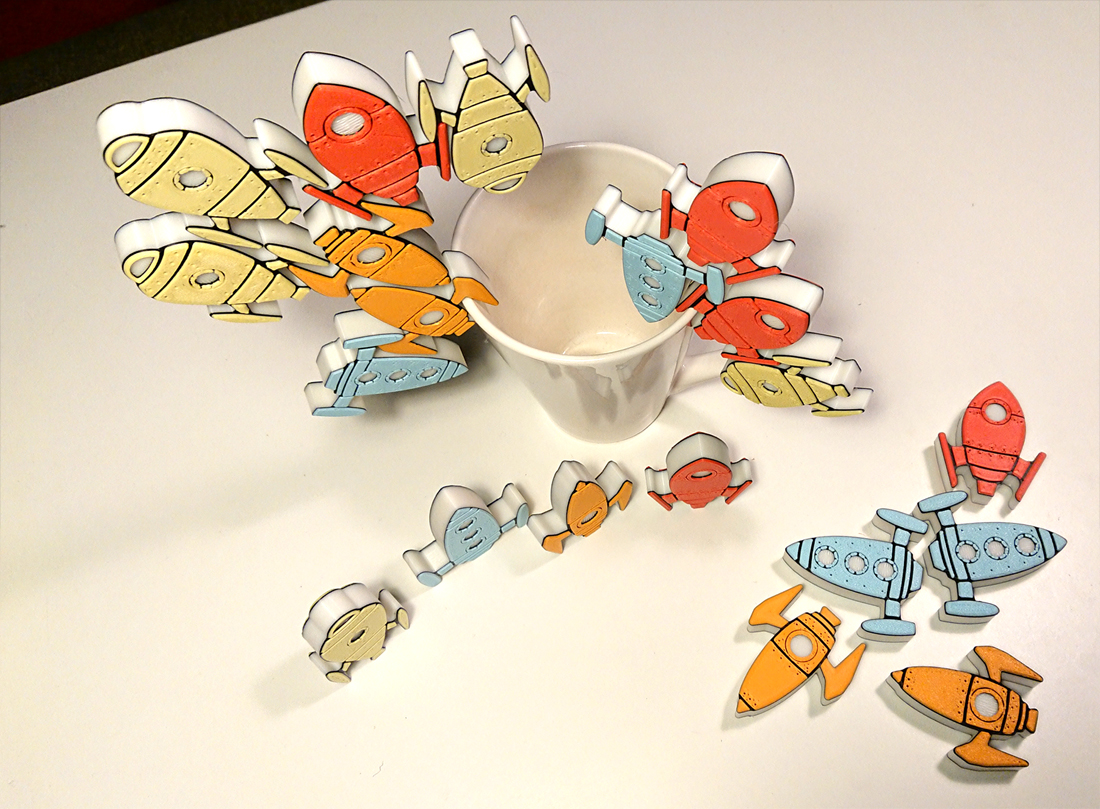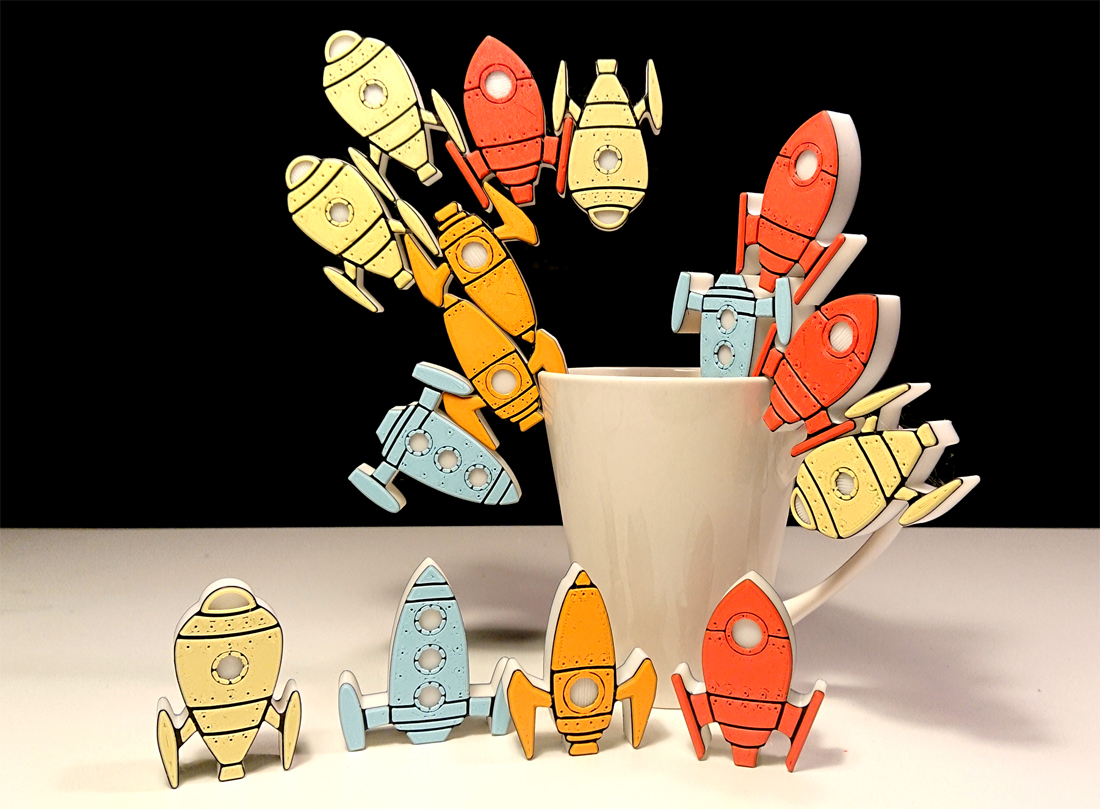 Each rocket is a stylized 2D drawing extruded into a compact 3D piece. Their small fins and booster shapes let them lock onto the rim of a cup, or any similar edge, turning your everyday mug into a bustling interplanetary launch site.