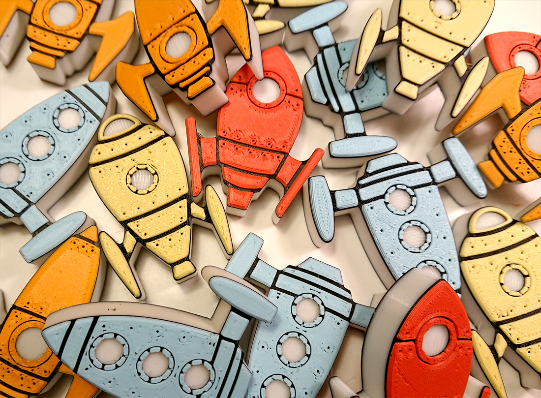 Each rocket is 3d printed with a highlight color, black and white PLA filament. Although it’s a multicolor print, it can be printed on every single extruder FDM/FFF 3D Printer by swapping the filaments throughout the print at the respective heights.